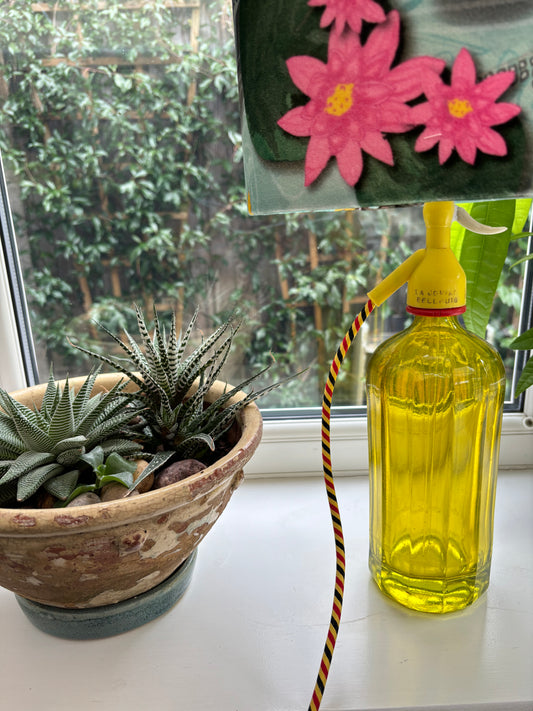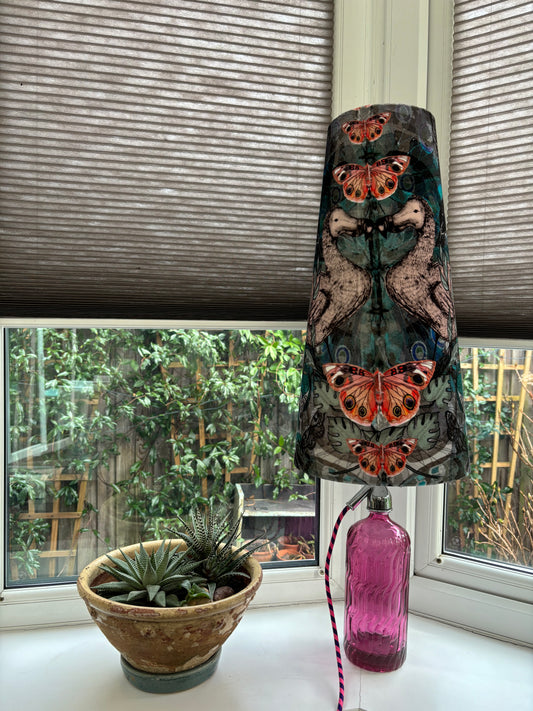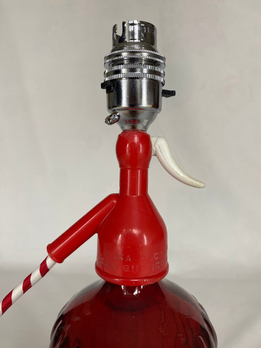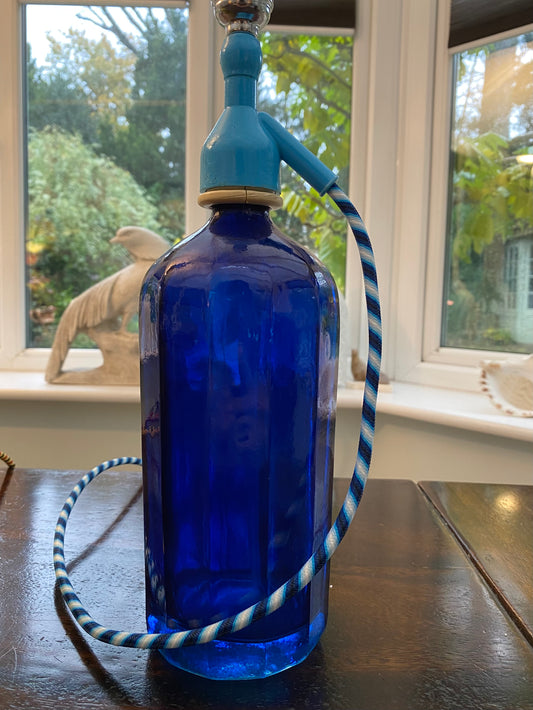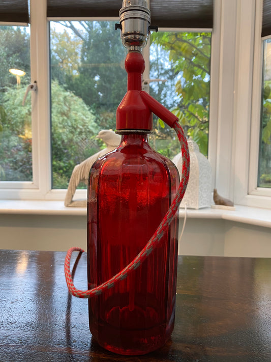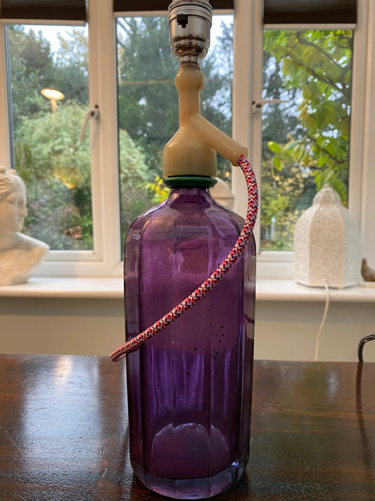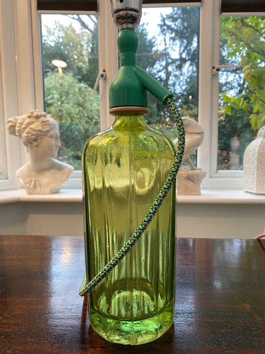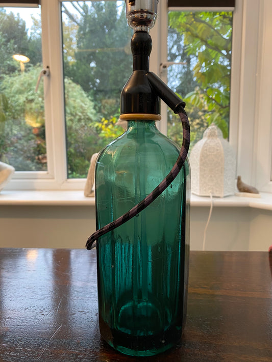 Early to mid century soda syphon table lamps. Every lamp is unique and complete with vintage patina and all original parts to maintain authenticity. The thick heavy colourful glass bottles make perfect table lamp bases and bring bright colourful vintage charm to any home or workplace. To convert into lamps, we use only brand new and EU safety compliant parts and every lamp is PAT tested before sale. They pair perfectly with our Cheeky Lampshade range!